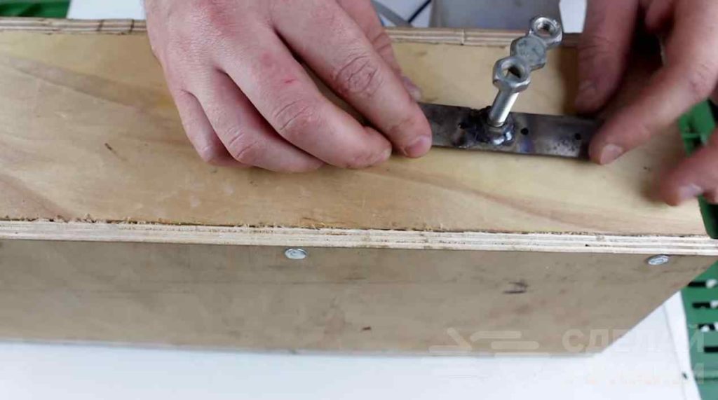 После этого сверлим в боковой стенке отверстие. Отрезаем кусок полосы металла и привариваем к ней гайку. Прикручиваем полосу к боковой стенке таким образом, чтобы гайка находилась напротив отверстия, и вкручиваем болт-вороток.