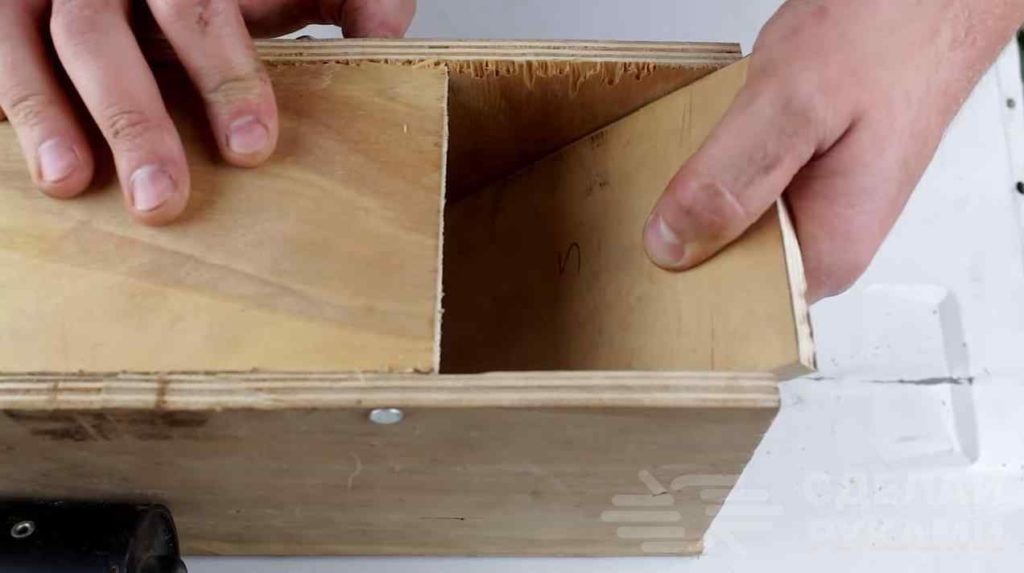 В нижней части корпуса крепим еще один кусок фанеры под углом — по нему будут скатываться расколотые орехи.