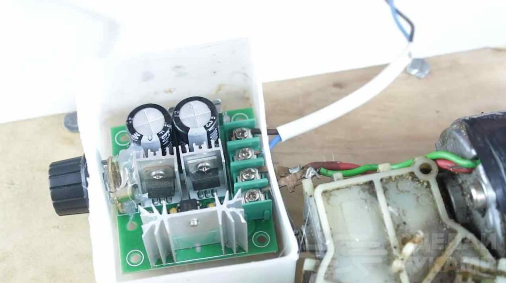 На последнем этапе останется только подключить двигатель к плате с регулятором оборотов. Всю электрику помещаем в пластиковый корпус, который крепим к боковой стенке фанерного корпуса.