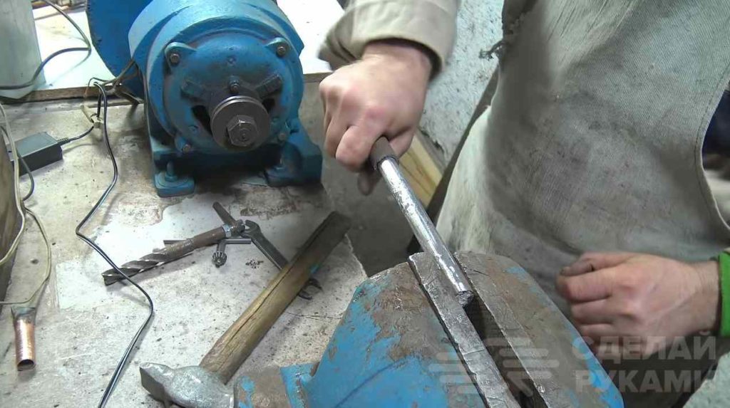 Для начала возьмём металлический обрезок трубы и подгоним его под размер круглого прутка.