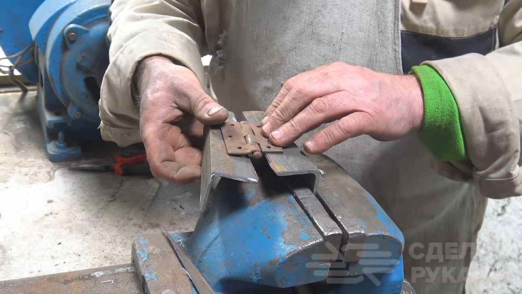 Далее привариваем старую дверную петлю, соединяя оба уголка. Получаем сужающийся пресс из уголка. К одному из уголков, под небольшим углом привариваем пруток, отрезанный ранее.