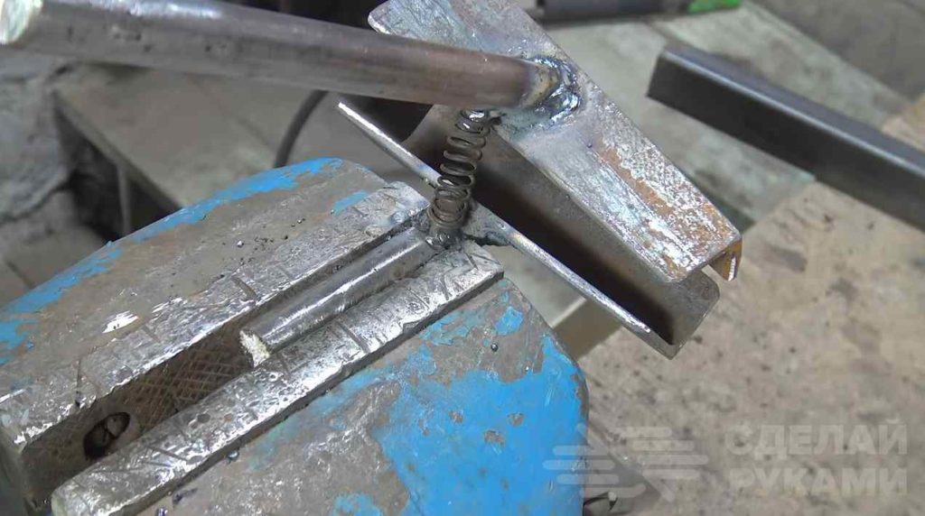 Ко второму уголку привариваем такой же кусочек прутка, только гораздо меньшей длины. Для крепления обратной пружины навариваем кусочки шпильки на оба прутка и устанавливаем пружину.