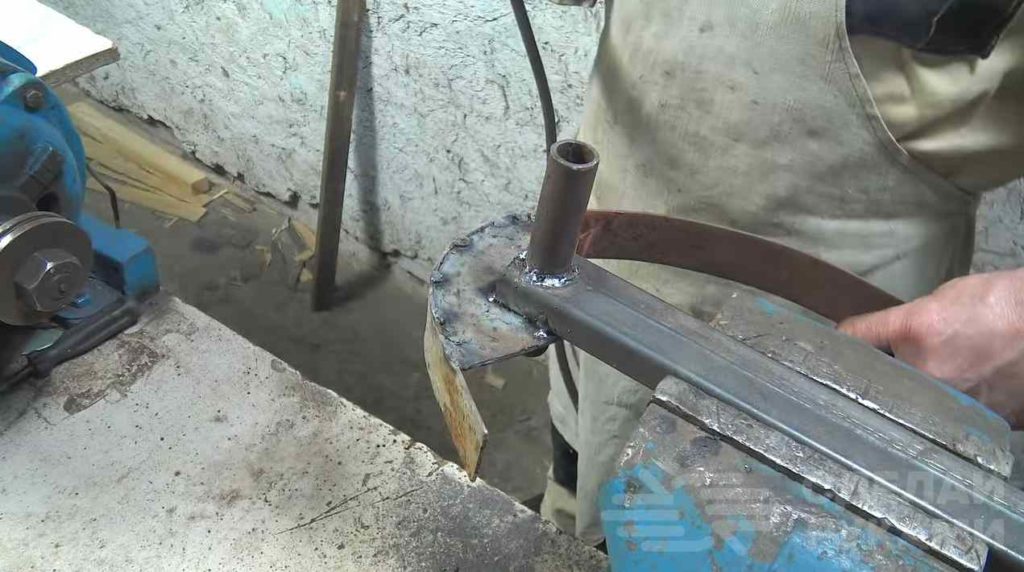 После этого привариваем круглую трубку, просунув её на одну четверть через профильную трубу. Устанавливаем конструкцию из второго этапа в трубу. Закрепляем подшипник на край малого прутка.