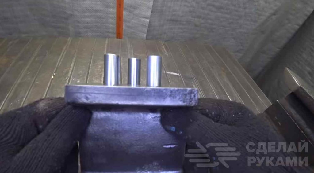 Далее в верхней части ж/д рельса необходимо будет просверлить три отверстия диаметром 14 мм. От круглого стального прутка такого же диаметра отрезаем три куска и забиваем их в эти отверстия.