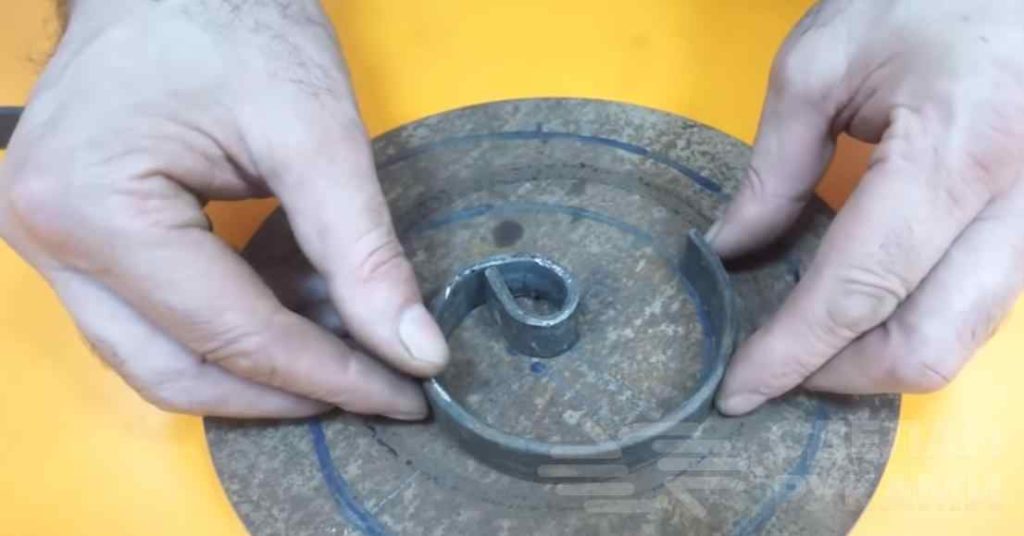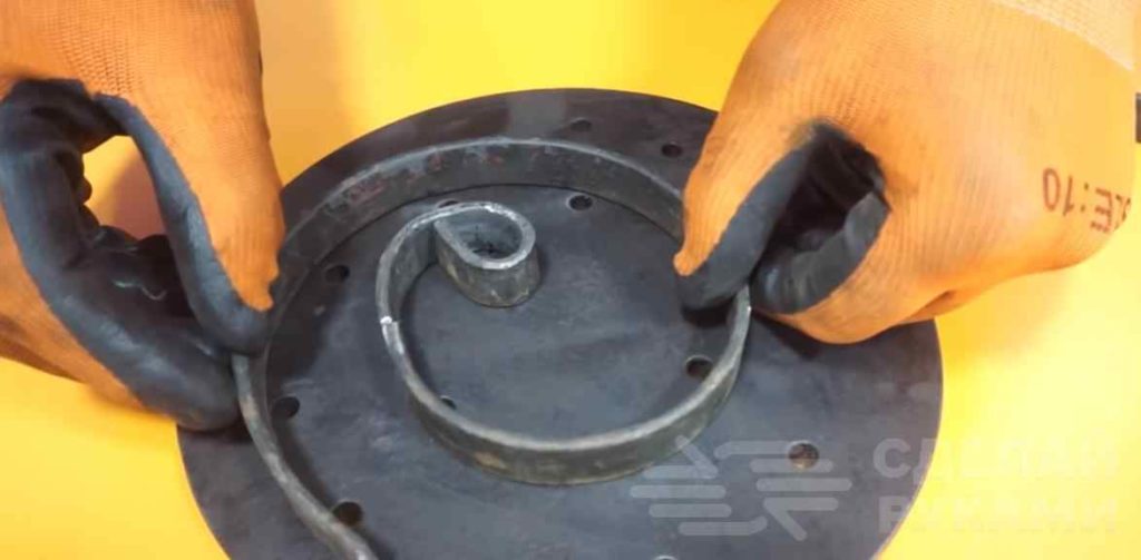 Далее приступаем к разметке всей формы спирали. После её разметки необходимо согнуть по её форме листовую полосу металла, той же толщины, что и стартовый завиток.
