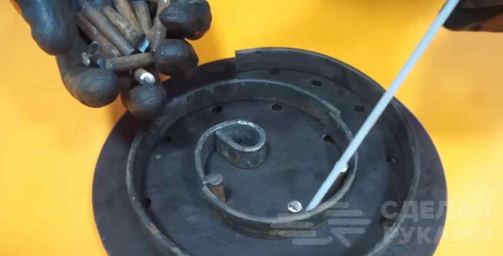 Для начала вырежем рабочую площадку из толстой листовой стали. Размечаем круг и вырезаем по контуру. Далее находим центр, и на него устанавливаем стартовый завиток. Его можно изготовить из полосы толщиной 4-6 мм, согласно чертежу.
