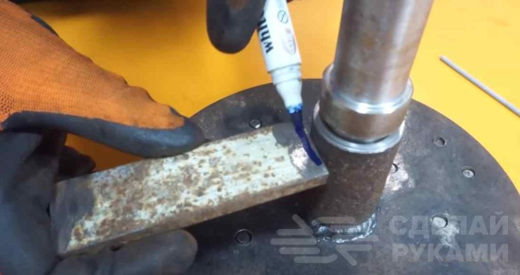 Надеваем на него подходящий отрезок металлической трубы и закрепляем конструкцию сверху болтом и шайбой так, чтобы осталось место для вращения. К нижней части площадки, строго по центру, привариваем вал.