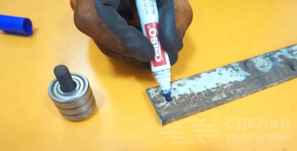 Ролик для прижимания и регулировки изготовим из трёх подшипников на болтовом соединении. Отрежем полосу металла, и вырежем в ней паз для того, чтобы она могла регулироваться на болтовом соединении.