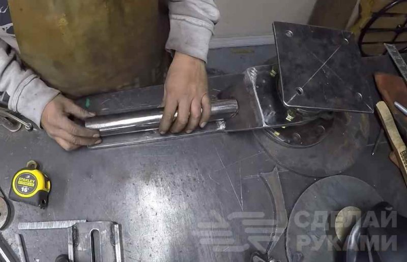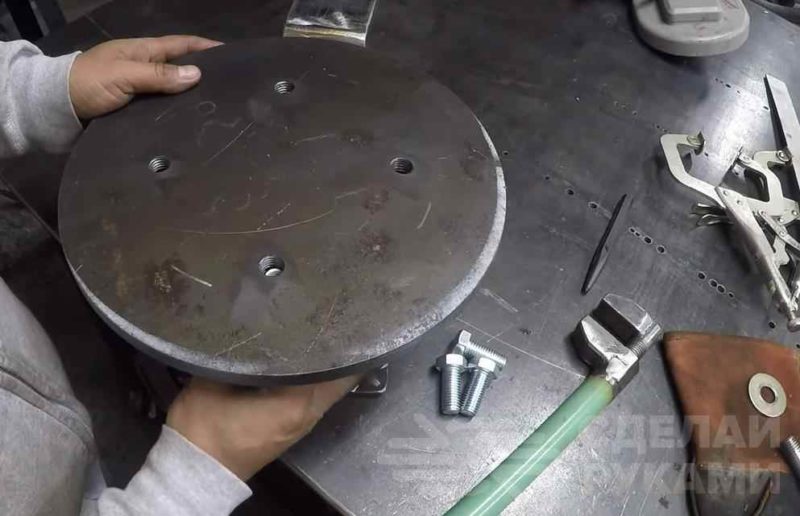 Отрезаем кусок металлической пластины квадратной формы, к которой привариваем по центру кусок круглой трубы. После этого крепим получившееся основание станка к автомобильной ступице.