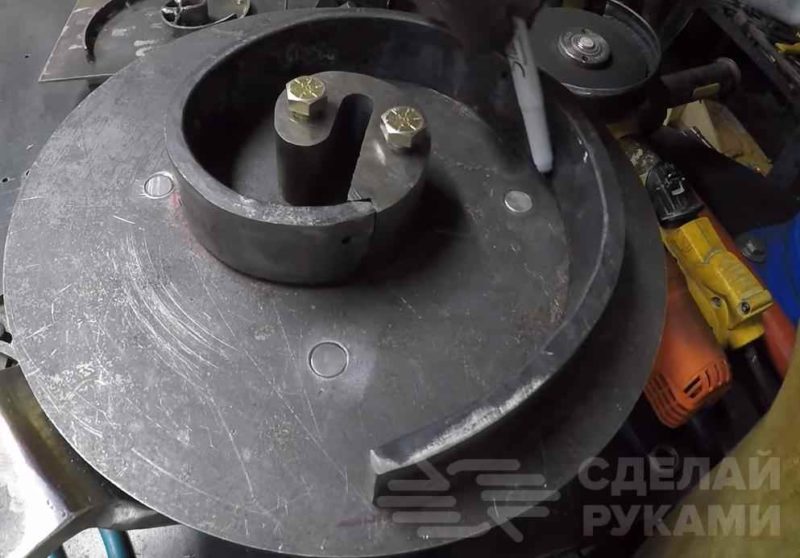 К большой улитке автор приваривает отрезки круглого прутка, под которые сверлит отверстия в круглой площадке.
