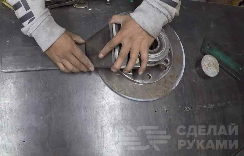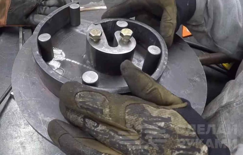 На следующем этапе вырезаем из листа металла круг и сверлим в нем крепежные отверстия, прикручиваем к ступице.