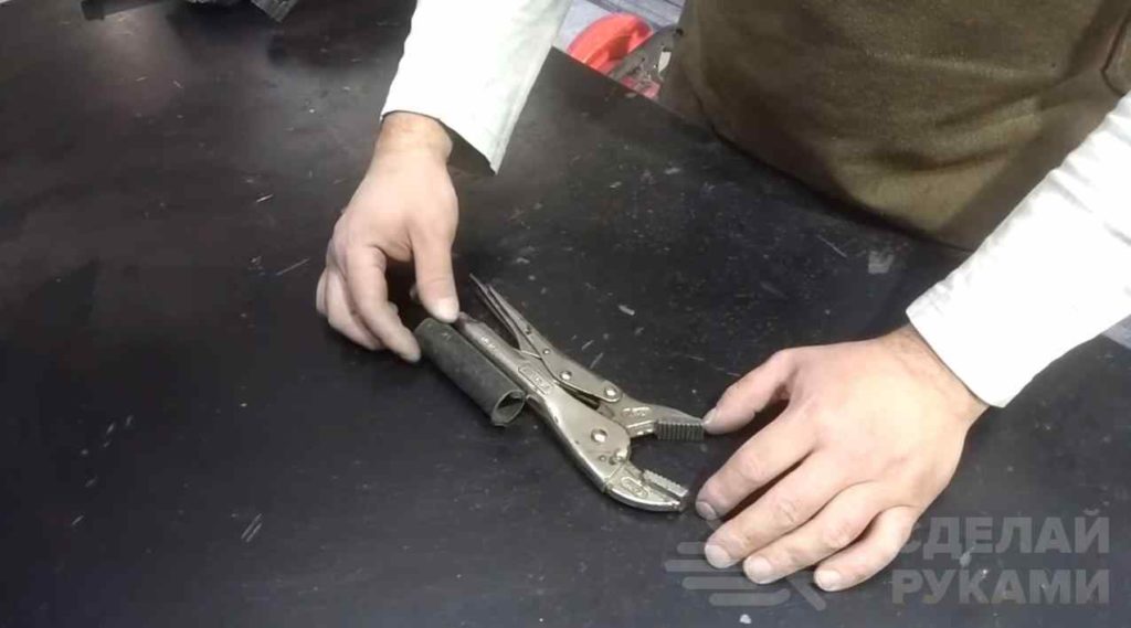 Таким образом, у нас получилась самодельная струбцина с посадочным местом для зажимных клещей. Приспособа крепится к верстаку, а в трубу вставляется сам зажим.