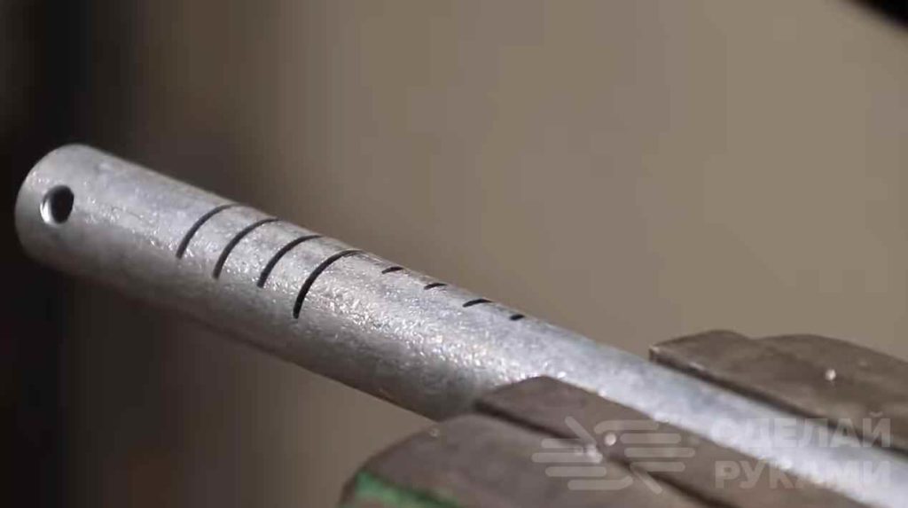 После этого автор делает разметку и с помощью болгарки прорезает небольшие прорези. Затем нужно будет сделать продольный паз на всю длину трубки.