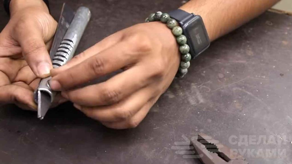 Далее с помощью болта и гайки соединяем полосу металла с трубкой. Причем полоса должна свободно входить в паз. Самоделка готова!