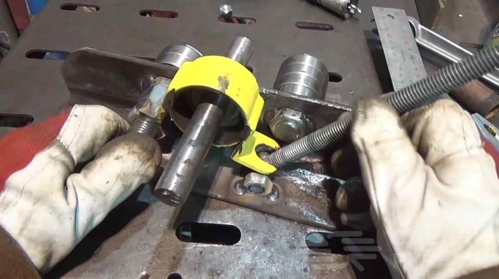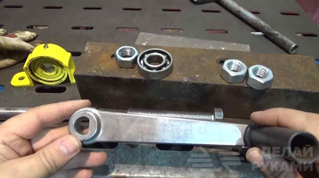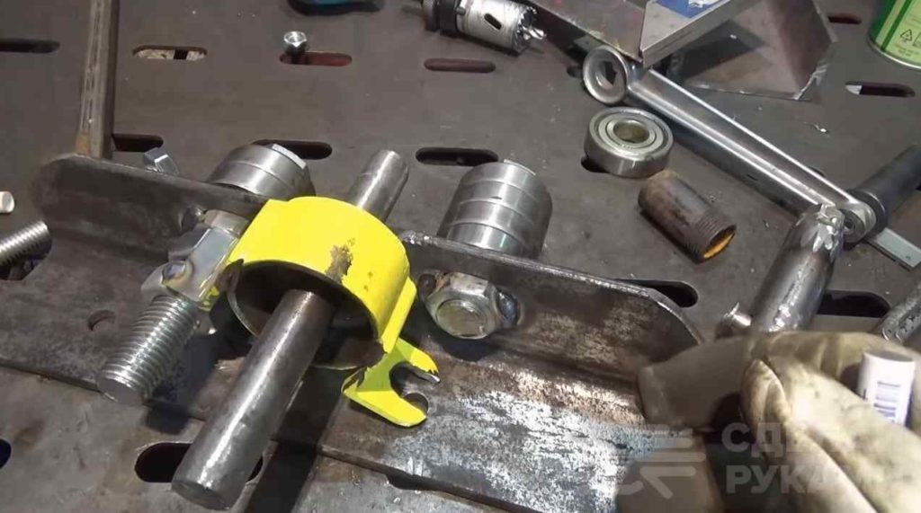 Далее необходимо будет установить корпусный подшипник с валом из круглого прутка диаметром 20 мм. На один болт накручиваем две гайки (затягивать сильно их не нужно — они должны свободно крутиться).