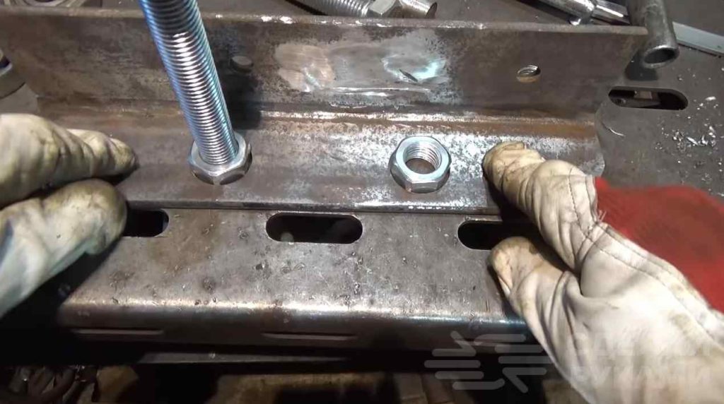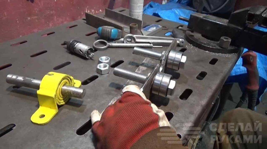 На следующем этапе берем болты М20, надеваем на них по два подшипника и шайбы, после чего вкручиваем их в приваренные гайки.