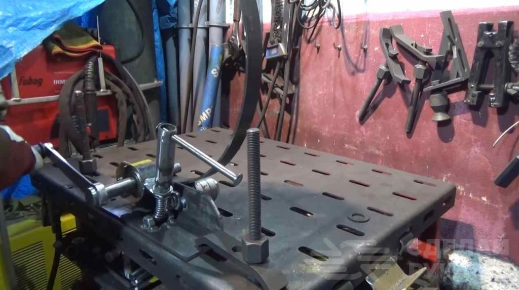 После этого из куска шпильки, болта и гайки автор изготавливает натяжитель. Его надо приваривать к уголку. Смотрите фото ниже.