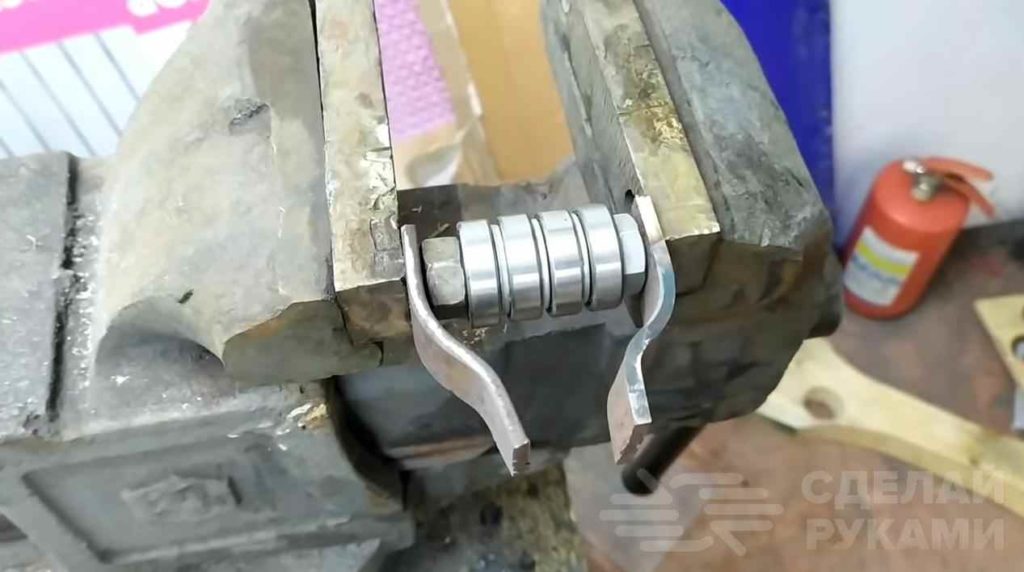 Далее автор отрезает две металлических пластины шириной 25 мм, нагревает их с помощью газовой горелки и сгибает, зажав в тисках. К получившимся креплениям привариваем ролик. Подшипники лучше снять, чтобы не испортить.