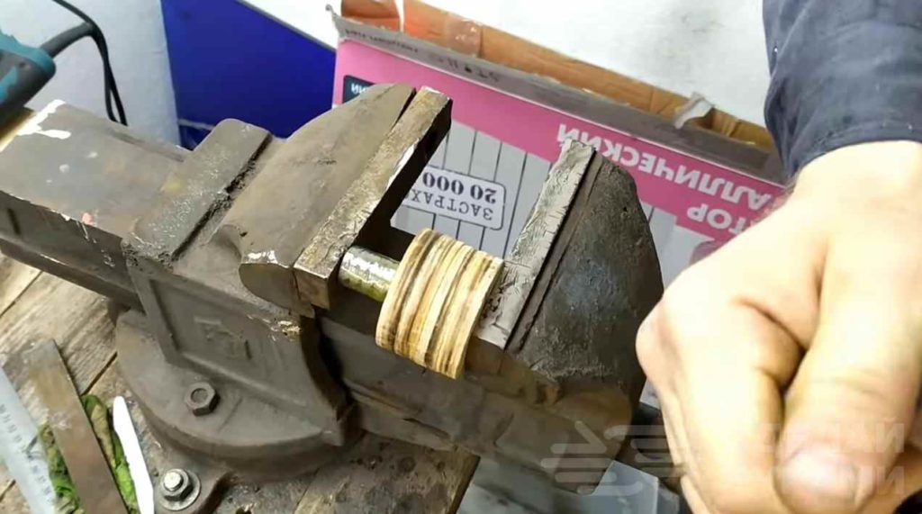 Далее необходимо сделать еще один ролик, но уже из фанеры. По центру нужно просверлить отверстие.