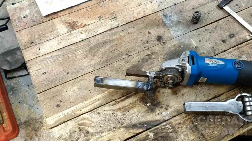 Из куска круглой трубы, квадратного прутка и болта с двумя гайками необходимо сделать еще одно крепление. Оно будет надеваться непосредственно на УШМ. К прутку приваривается кусок профтрубы.