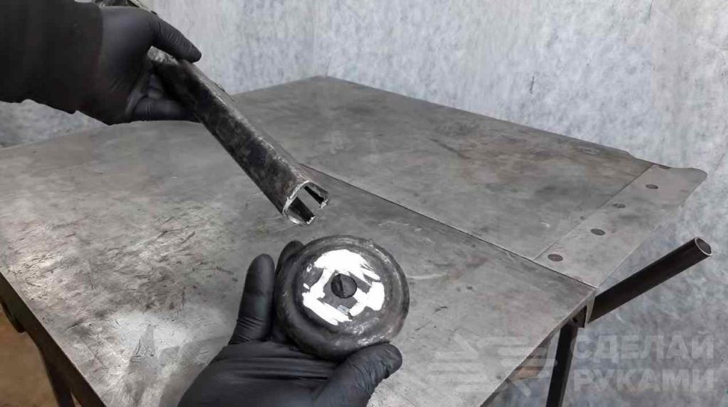 Из квадратных профильных труб делаем оси, к которым крепим подшипники (они выполняют роль колесиков), и привариваем их к основанию.