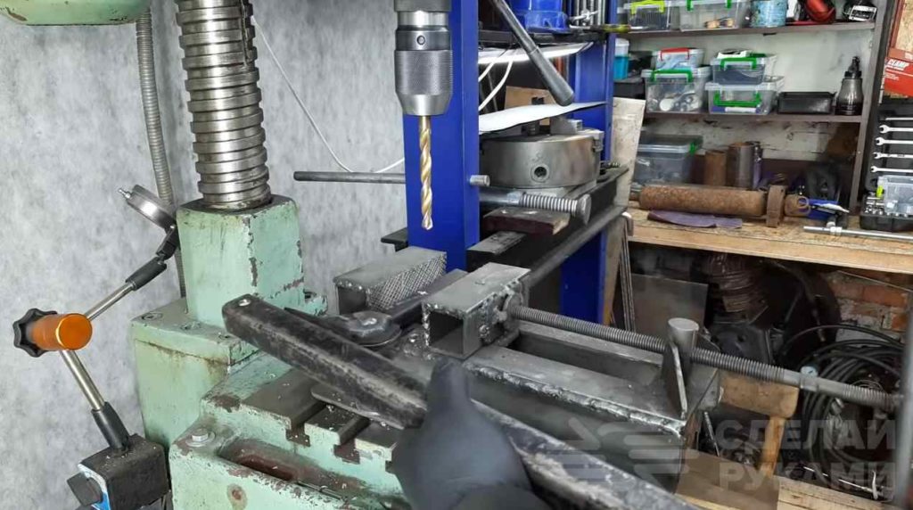 Не отходя далеко от сверлильного станка сверлим еще одно отверстие, но уже в «лапе» домкрата.