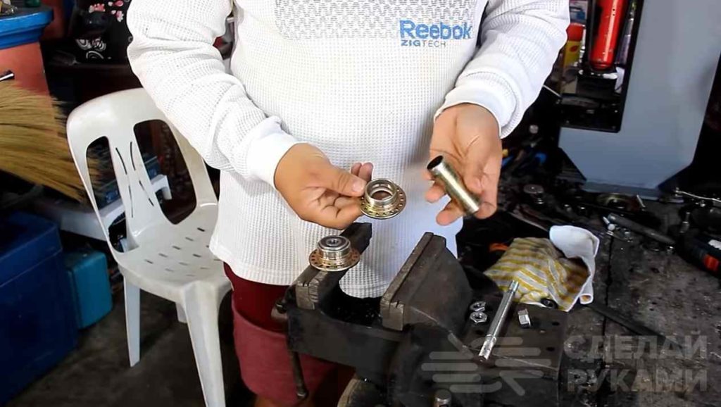 После этого надеваем на втулку кольцо и запрессовываем подшипники обратно. Закрепляем всё контргайкой.
