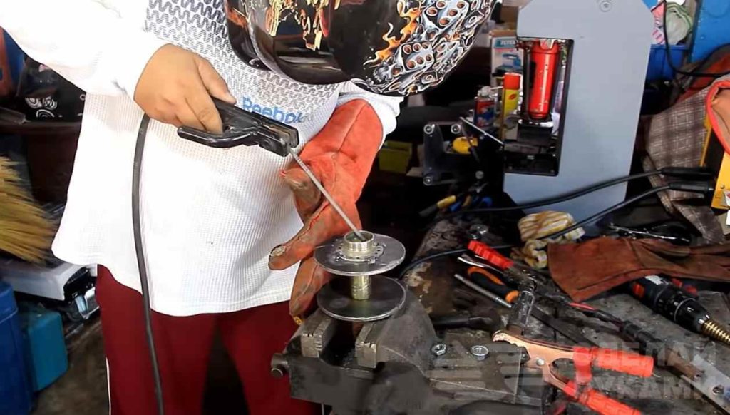 Далее вырезаем две круглые заготовки из листовой стали и сверлим отверстия, равные диаметру втулки. Надеваем круглые заготовки на втулку и привариваем.
