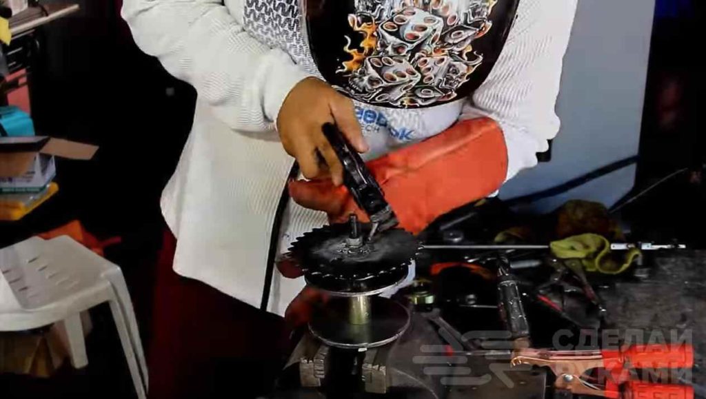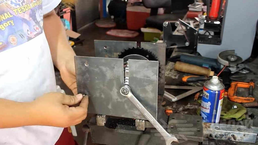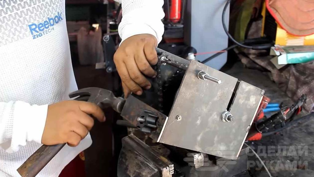 На круглую арматуру установим небольшую шестерню для вращения и привариваем её. Более длинный край выводим наружу корпуса. На оба края нужно установить контргайки. Устанавливаем цепь на весь механизм.