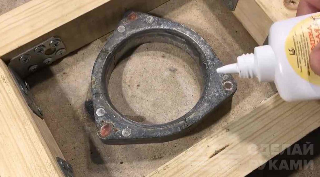 Из деревянных брусков и металлических уголков собираем рамку, внутрь которой необходимо поместить образец. Чтобы легко отделить форму от формовочной смеси, автор использует детскую присыпку.