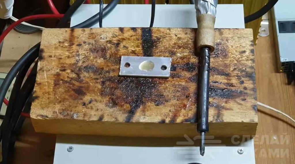 Расплавляем необходимое количество припоя, после чего несколько секунд прогреваем алюминий, затем движениями вперед-назад пытаемся залудить нужный участок.