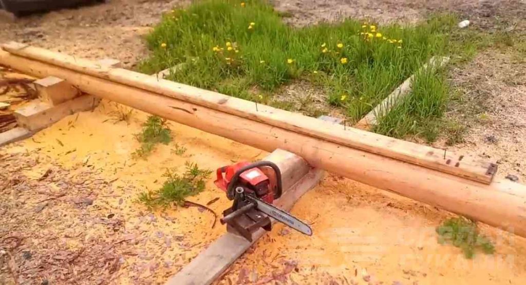 Далее по центру бревна нужно при помощи саморезов прикрутить направляющую из доски, по которой будет перемещаться ползун с бензопилой.
