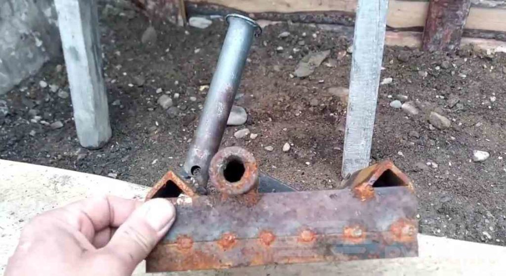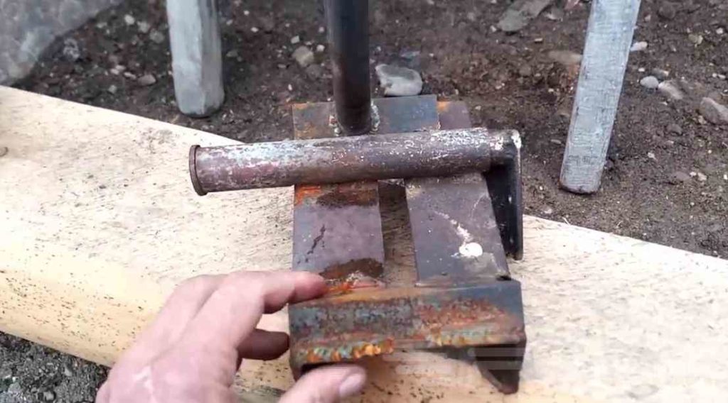 Для изготовления оснастки автор использует отрезки уголка, сваренные между собой, а также круглую трубу, которая служит ручкой. Сбоку надо сделать крепление для бензопилы. Оно должно вращаться на 360 градусов.