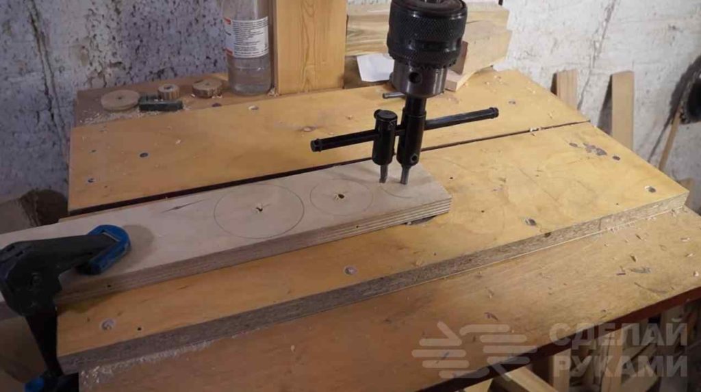 Первым делом размечаем на листе фанеры будущие шкивы разного диаметра. Просверливаем строго по центру отверстия для центрировки. Устанавливаем в патрон сверло балеринку и выравниваем его, согласно радиусу будущего шкива.