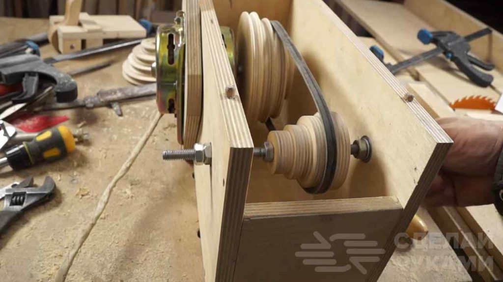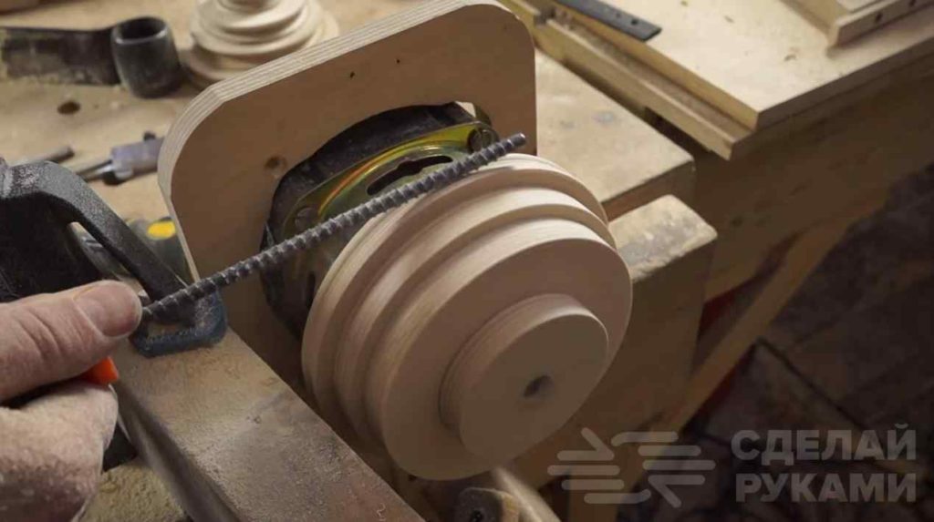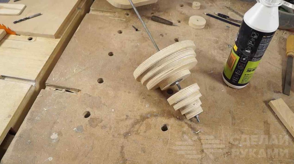 Высверливаем шкивы. Далее на шпильке закрепляем каждый диск, предварительно смазав стороны столярным клеем. Зажимаем всё при помощи гаек и оставляем высыхать нашу заготовку.