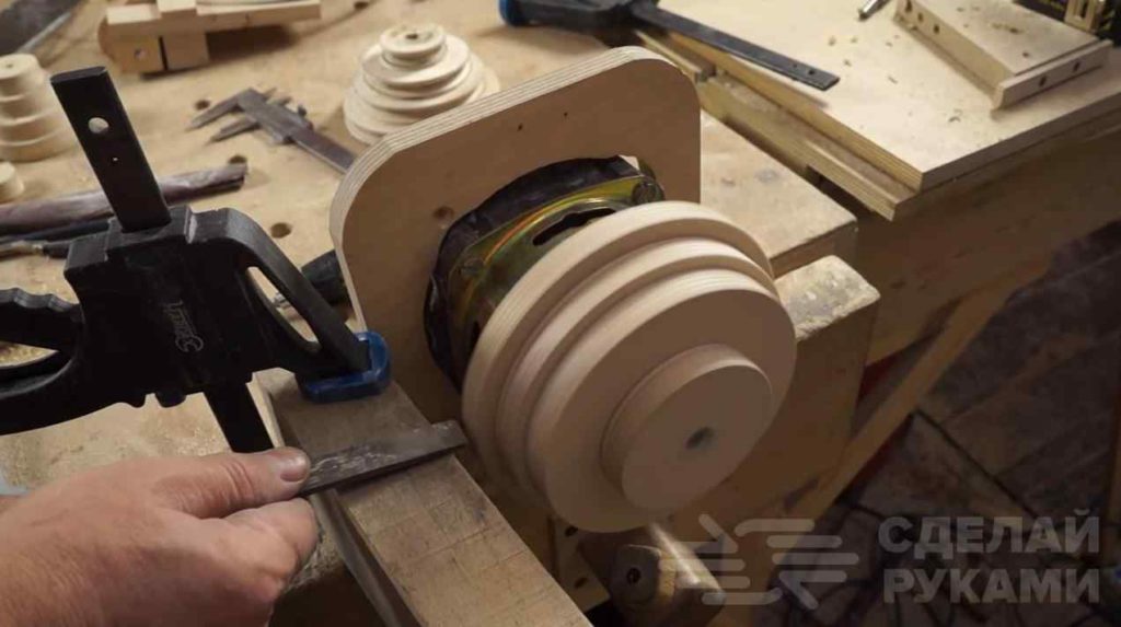 Для вырезания паза нам понадобятся несколько стамесок и двигатель с валом, на котором в будущем будут крепиться наши шкивы. Установив упор, перпендикулярно вращающемуся диску, начинаем обработку.