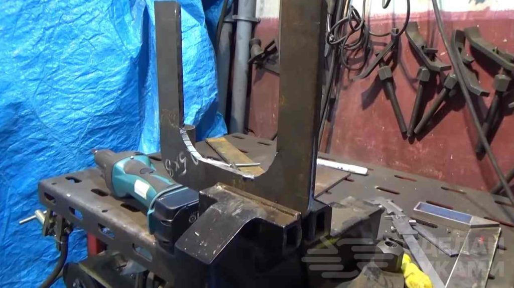 Для начала изготовим раму тисов. Для этого из куска листового железа вырезаем U-образную заготовку, предварительно разметив её на плоскости. Примеряем деталь ко второму листу, который будет нашим основанием.