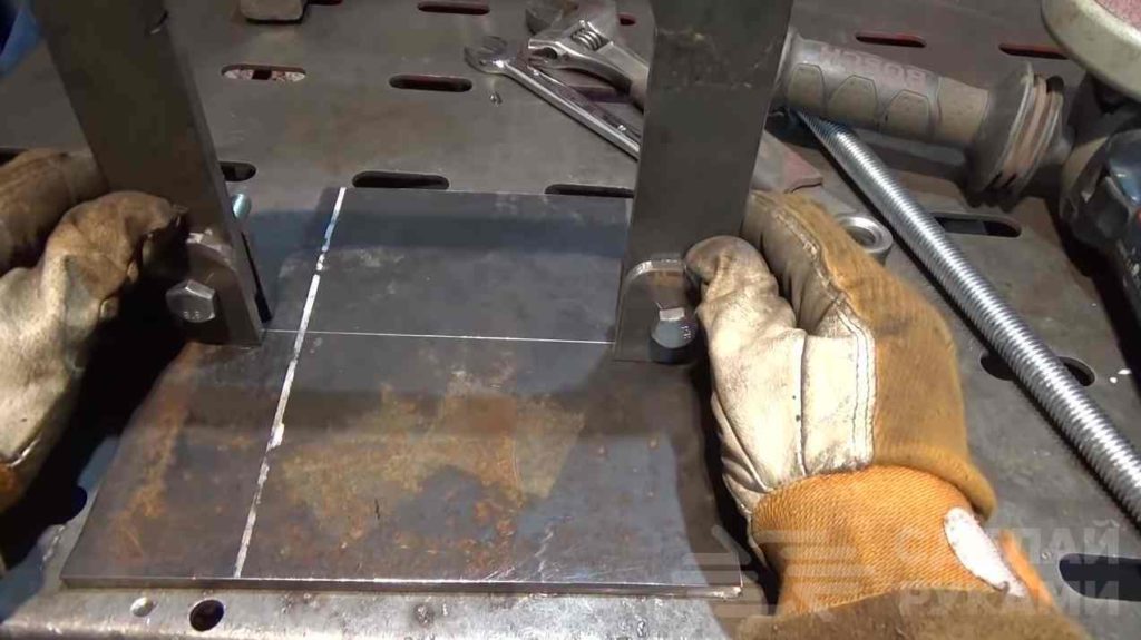 На рабочий столик устанавливаем уголок, строго соблюдая градусы установки. Чтобы не ошибиться, что уголок установлен правильно, под его обе стороны подкладываем более мелкие уголки меньшей ширины. Прихватываем всё сваркой и провариваем по всей длине.