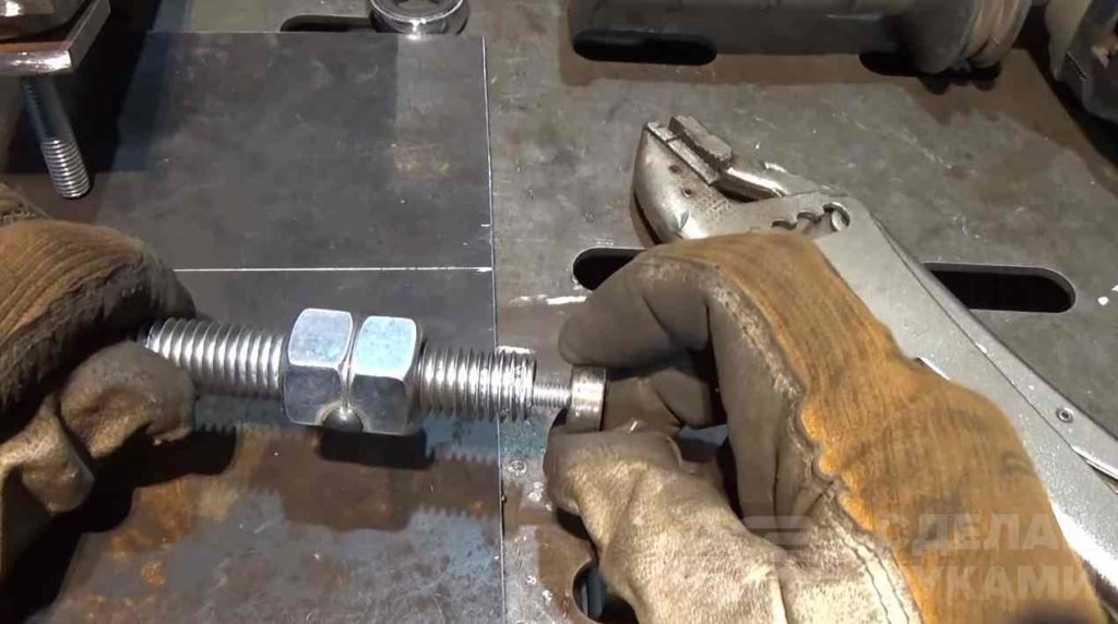 Для изготовления упора (он же вороток) возьмём шпильку диаметром 14-16 мм. Накрутим пару гаек и сварим их между собой (для облегчения можно взять удлиненную гайку необходимого диаметра).