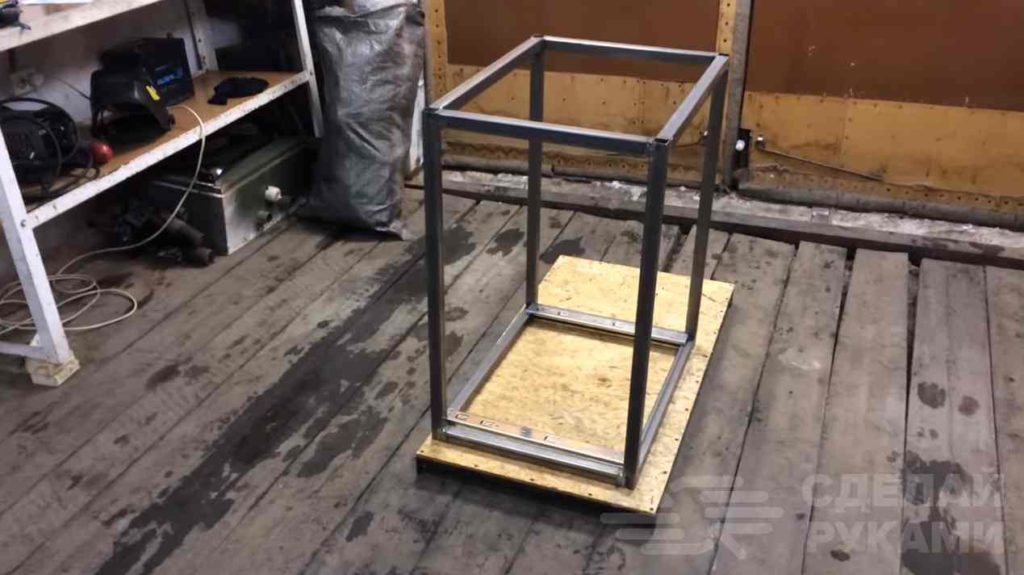 Далее из фанеры нужно вырезать столешницу и три стенки, чтобы закрыть заднюю и боковые части металлического каркаса. Под столешницу необходимо будет приварить усиления из профильной трубы 20х20 мм.