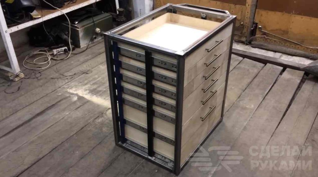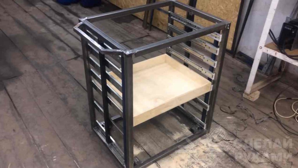По бокам мастер приваривает еще по две профтрубы, которые выступают в качестве дополнительных ребер жесткости. После этого крепятся мебельные направляющие (в данном случае автор использует 7 комплектов).