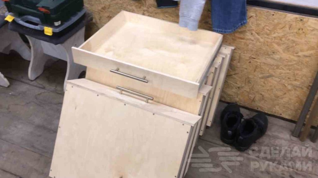 На следующем этапе необходимо будет сделать ящики из фанеры. Прикручиваем их к мебельным направляющим. Потом надо прикрутить фасады и ручки.