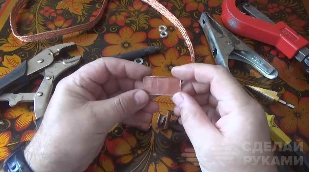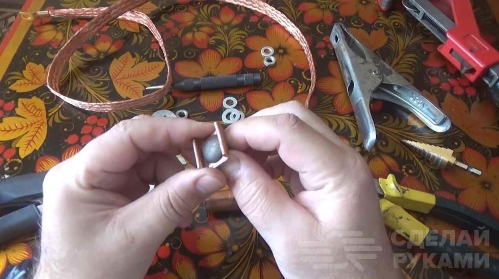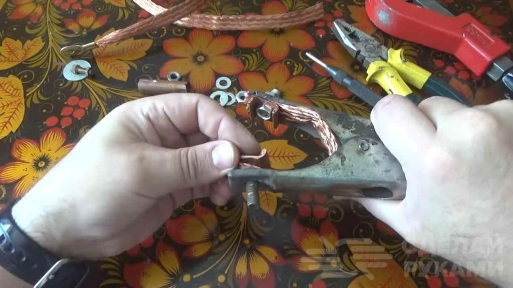 Далее отрезаем подходящий по длине кусок медной шины (плетеной «косички»), после чего крепим его вместе с губками к контактному зажиму.
