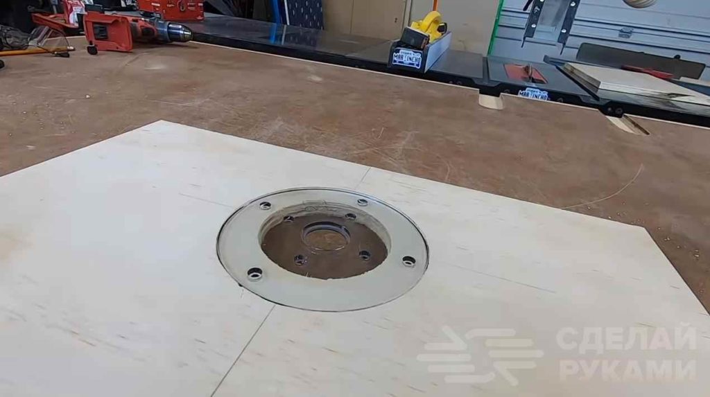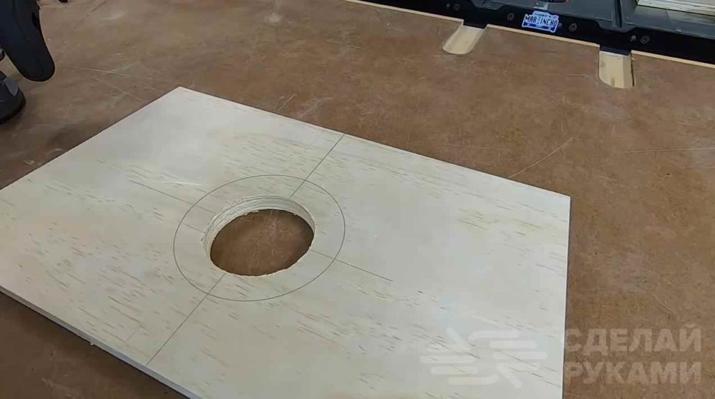 Для изготовления фрезерного столика будем использовать фанеру. И первым делом вырезаем столешницу нужного размера.