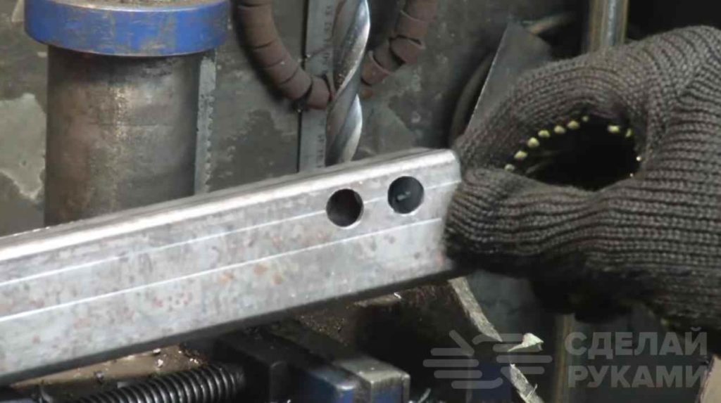 Сначала нужно будет отрезать кусок профтрубы подходящей длины, после чего размечаем посадочные места под подшипники и сверлим отверстия диаметром 12 мм.
