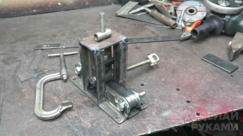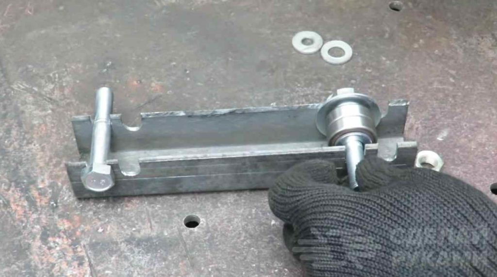После этого останется только изготовить сам прижимной блок, который состоит из резьбовой шпильки (винта от домкрата), двух подшипников и куска толстостенной трубы. Также потребуются шайбы и куски квадрата.