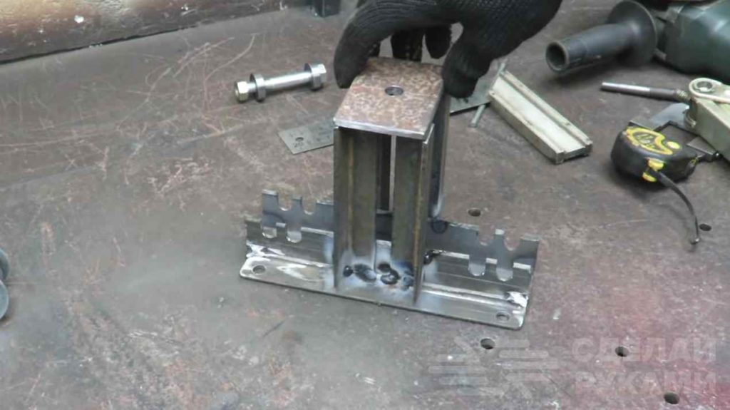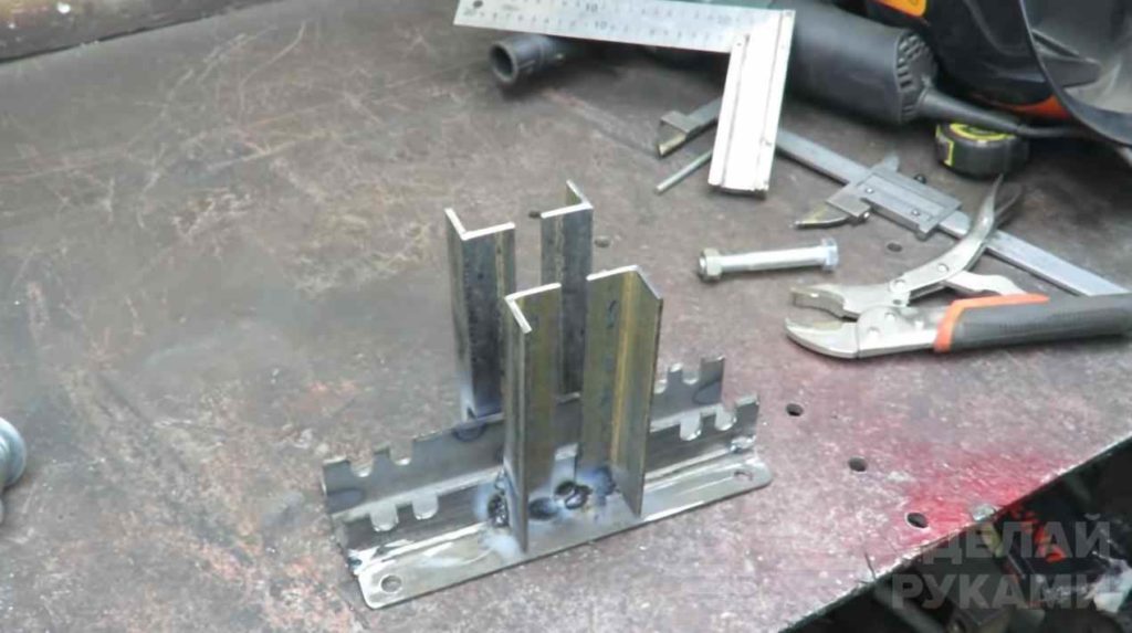 Крепление для трубогиба автор изготавливает из металлического уголка 25*25 мм. Болгаркой срезаем часть одной из полок уголка, чтобы он не упирался в болты. Привариваем элементы крепления к профильной трубе. Сверлим отверстия диаметром 10 мм.