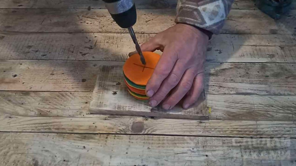 Кружки укладываем друг на друга, и по центру сверлим отверстие под болт. Далее на болт надеваем стальной диск, потом «пирог» из губок и прижимаем все вторым диском с гайкой.