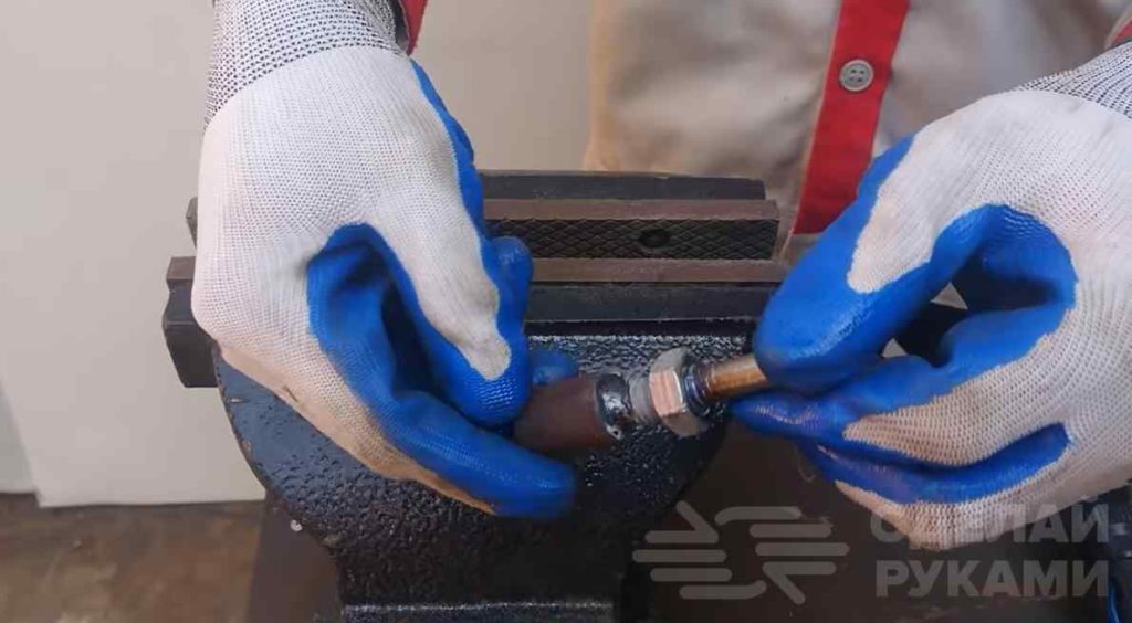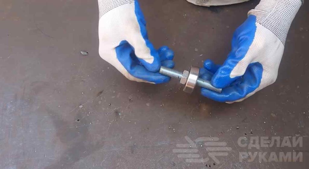 Первым делом приступаем к изготовлению эксцентриков. Для этого отрезаем от шпильки отрезок необходимой длины и снимаем резьбу, при помощи вращения и обточки болгаркой.