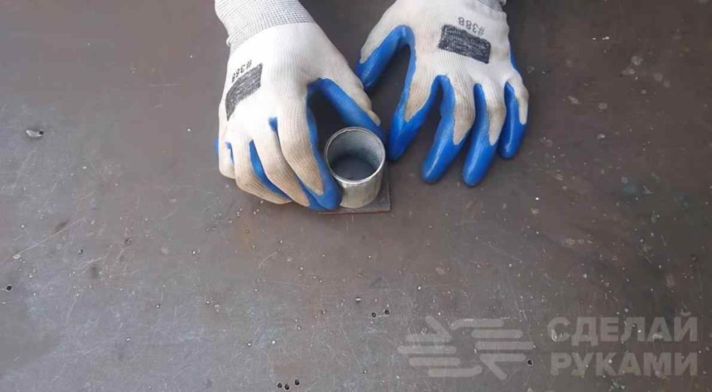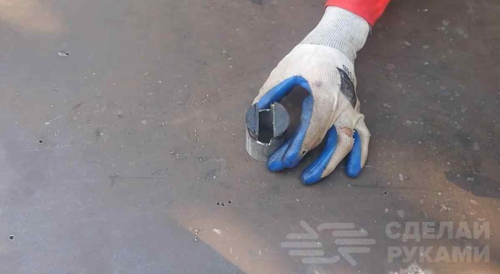 Корпус для механизма изготавливаем из кусочка круглой трубы, равной по внутреннему диаметру большому подшипнику механизма. Завариваем с одной стороны при помощи железной пластины, и размечаем прорезь для ножей.